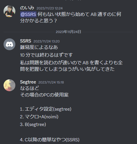 SSRS: C 以降を読む segtree: PC のセットアップ→B もしくは SSRS から考察するべき問題を貰う noimi: PC のセットアップ中に A, B を解いてそのまま書き始める